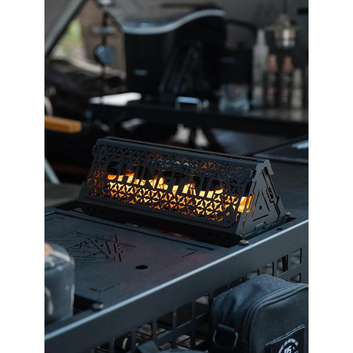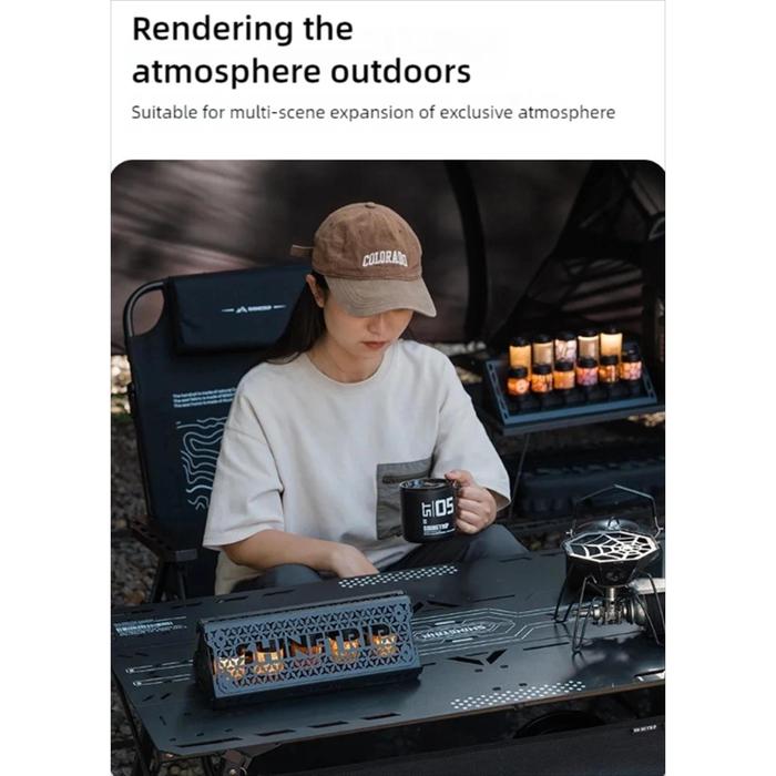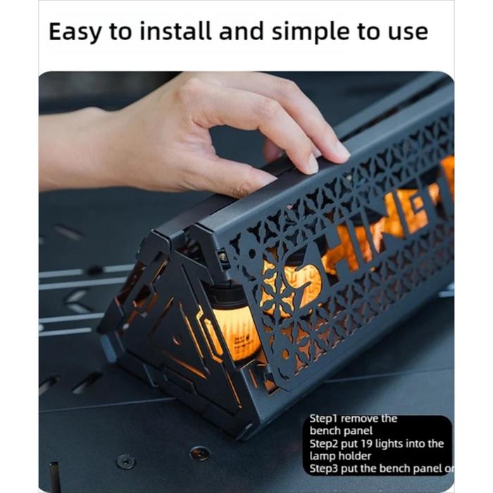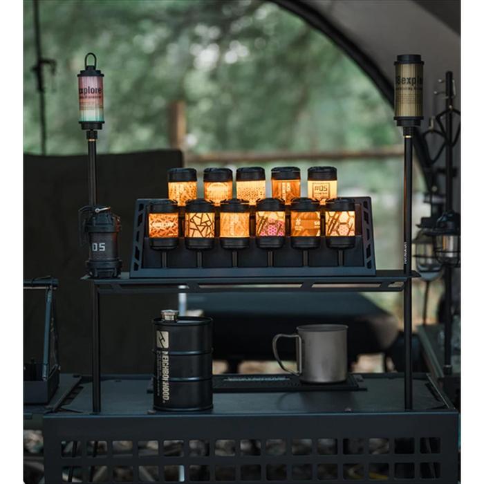 Dudukan lampu dengan desain ‘benteng’ yang menciptakan permainan cahaya dan bayangan yang indah, cocok untuk menjadi pusat perhatian di meja camping