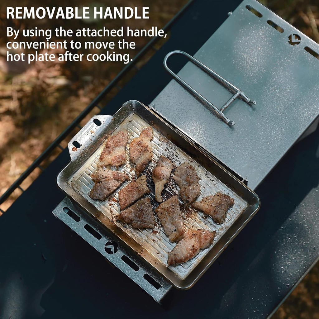 Gagang Removable di Grill Plate: Lubang khusus di sisi grill memudahkan pemasangan gagang untuk mengangkat alat tanpa menyentuh permukaan panas.