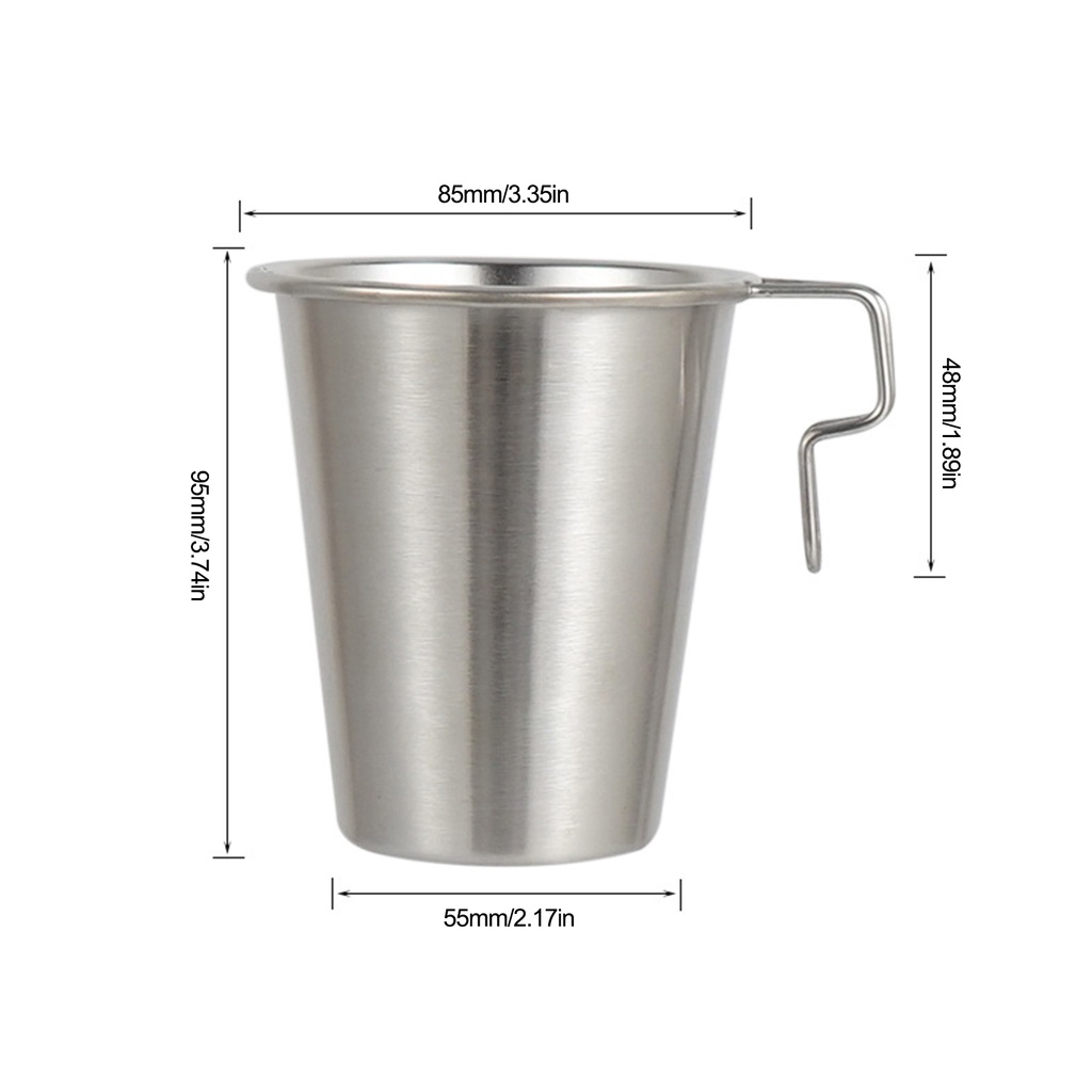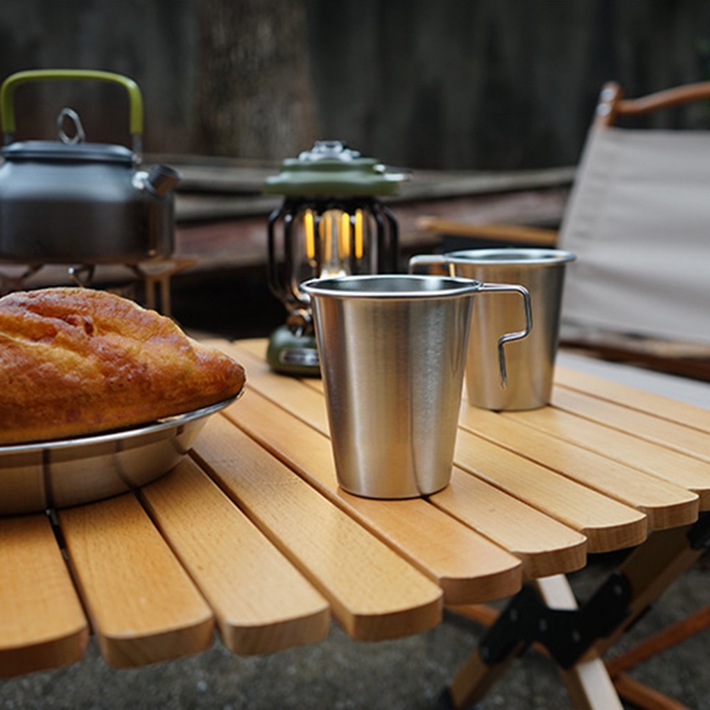 Cangkir berkemah portabel terbuat dari baja tahan karat 304, tidak berbau, kuat, mudah dibersihkan, anti melepuh, dan anti jatuh. Dengan pegangan yang dapat dilipat, mudah dibawa dan diatur. Ini adalah penolong yang baik untuk berkemah di luar ruangan memasak.
