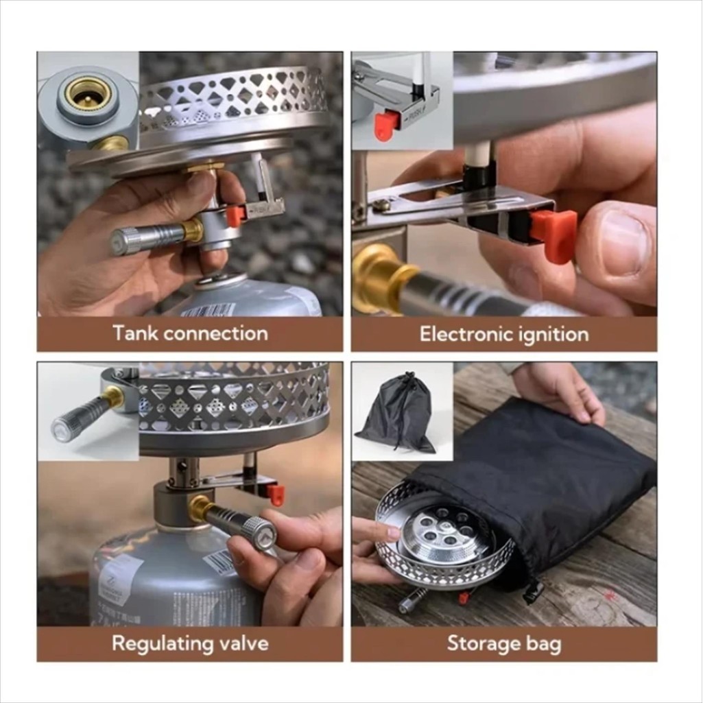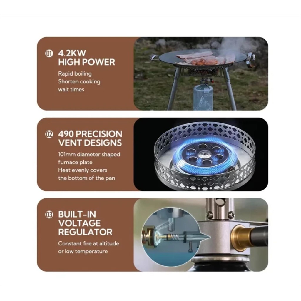 - Desain Anti-Angin & Stabil: Memiliki 490 lubang ventilasi presisi pada pelat pembakar berdiameter 101mm, memastikan distribusi panas merata dan tahan terhadap angin kencang.