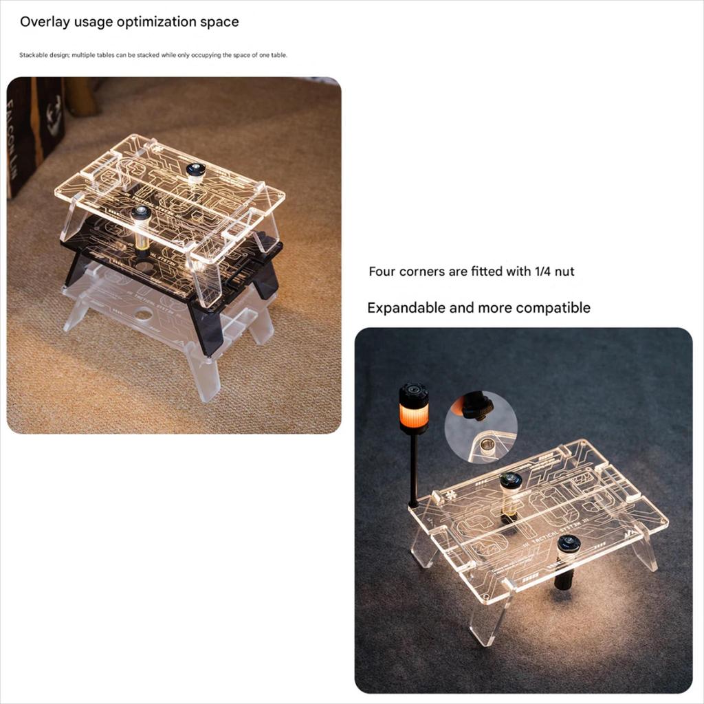 – Optimalisasi Cahaya (Atmosphere Needs): Meja ini dirancang dengan lubang khusus untuk menaruh lampu (seperti Goal Zero atau seri 19). Saat lampu dinyalakan, cahaya akan berpendar melalui permukaan akrilik, menciptakan suasana hangat dan dramatis di malam hari.