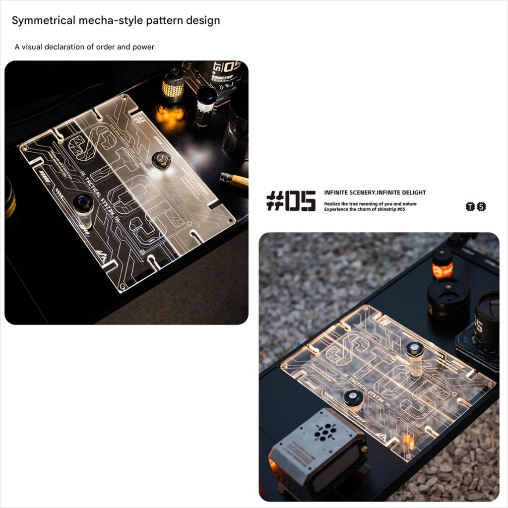 – Desain Mecha Symmetris & Transparan: Memiliki pola grafis tactical yang simetris, memberikan kesan “Order & Power” pada area camping. Material akrilik kristal memastikan kejernihan maksimal tanpa distorsi warna.