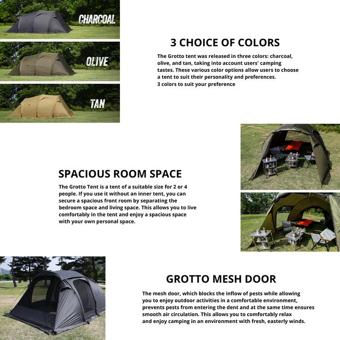 Minimal Works Grotto Tent adalah tenda yang dioptimalkan untuk digunakan oleh 2 hingga 4 orang. Ini lebih besar dibandingkan Boniato namun lebih kecil dari Albergue, sehingga dapat dengan mudah dipasang oleh satu orang. Tenda ini sangat baik dalam merespons perubahan cuaca apa pun musimnya, berkat itu struktur tipe terowongan dengan garis lengkung yang elegan dan keterbukaan yang sangat baik.