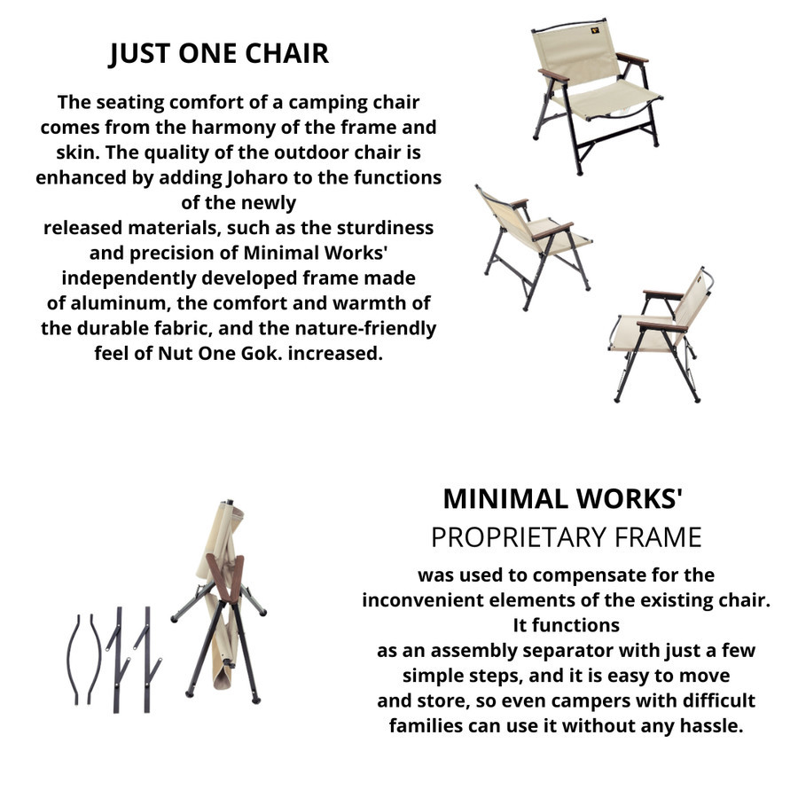 The B in Minimal Works Life Chair B has an ambiguous meaning of Brilliance and Balanced, and has an ambiguous meaning of structure, design, It contains the meaning of being the only chair that surpasses existing outdoor chairs by harmonizing materials, etc. This outdoor chair was completed after three years of effort to remain faithful to its essence. Minimal Works developed its own frame to eliminate as many of the inconvenient elements of existing chairs as possible. Amazing storage capacity, simple and luxurious design, and comfortable seating for any activity.