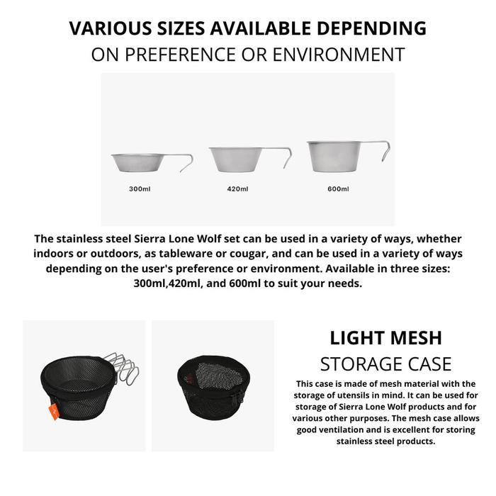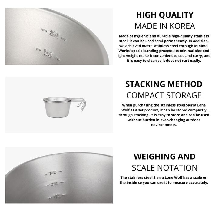Minimal Works Stainless Steel Sierra Lone Wolf adalah peralatan makan outdoor yang terbuat dari stainless steel dengan pasca-pemrosesan khusus Minimal Works. Sierra Lone Wolf berbahan baja tahan karat tersedia dalam tiga ukuran: 300,420, dan 600. Ukuran yang pas untuk menampung berbagai makanan seperti nasi, sup, dan minuman, serta mudah dipegang dan digunakan dengan pegangan Sierra Lone Wolf saat berkemah.