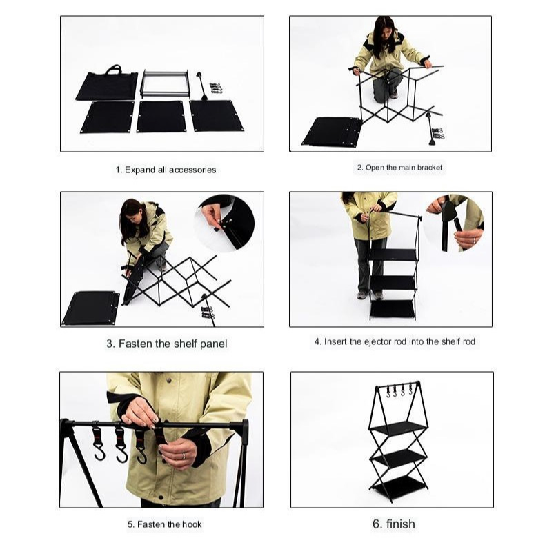 Rak susun lipat aluminium. Dapat digunakan saat kegiatan outdoor, camping atau sebagai tempat menaruh berbagai barang di rumah. Mudah dibawa, ringan serta mudah untuk dilipat.