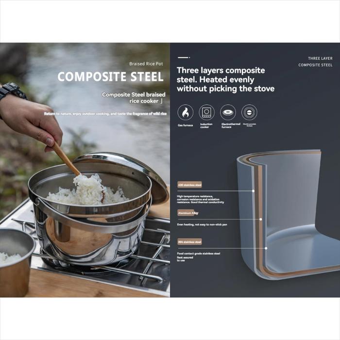 Braised Rice Cooker CC-21 terbuat dari material composite steel berkualitas tinggi dengan lapisan ganda, panci ini mampu menahan suhu tinggi dan mendistribusikan panas secara merata, menjamin nasi tidak gosong dan matang merata.