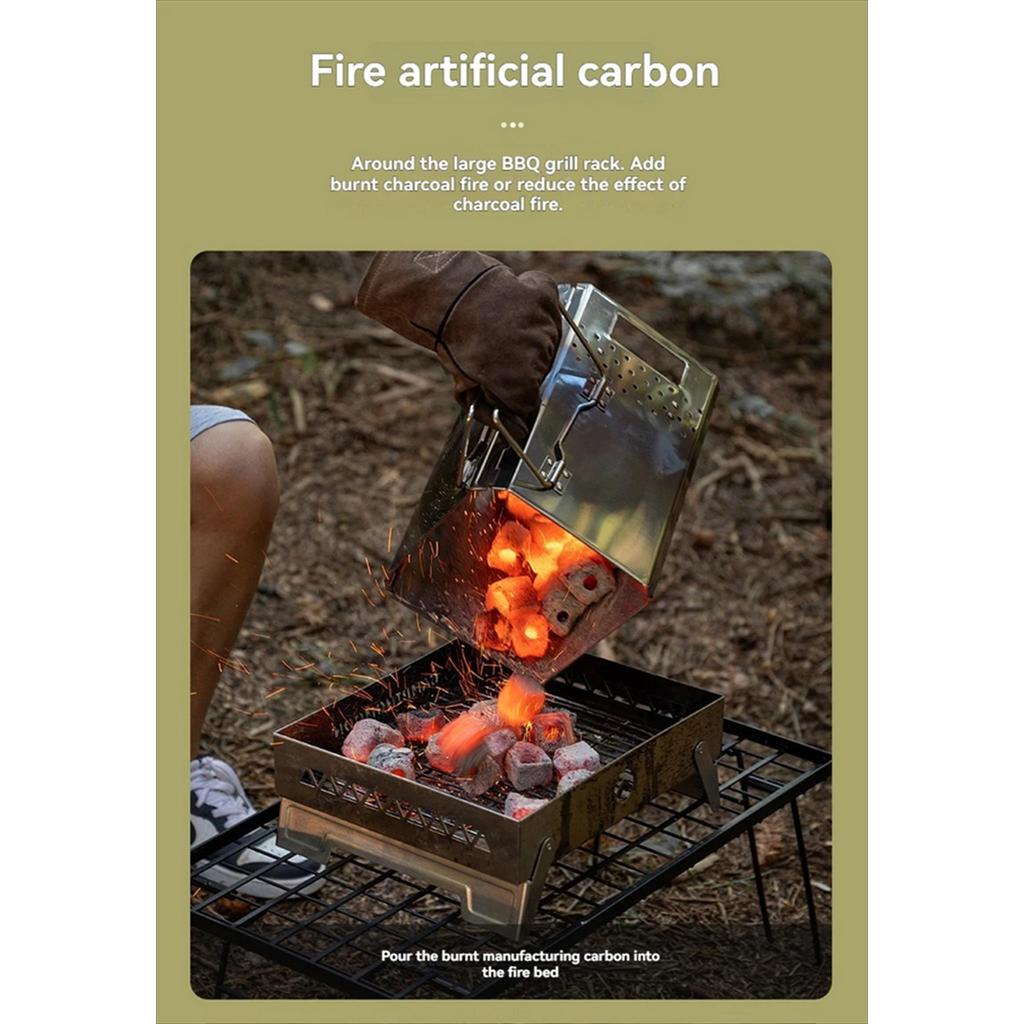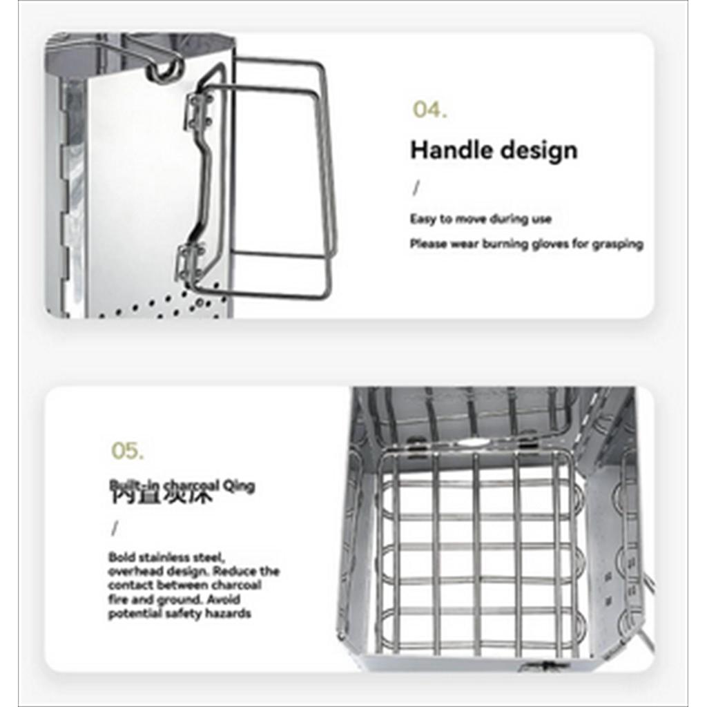 – Built-in Charcoal Grate: Menggunakan desain overhead dengan baja tebal untuk mengurangi kontak langsung antara api arang dengan permukaan tanah, menjaga keamanan lingkungan sekitar.