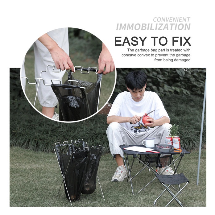 Rak sampah portable yang dapat digunakan dan dibawa kemana-mana. Memudahkan aktivitas sehari-hari.