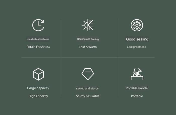– Panas yang tahan lama, penyimpanan dingin yang tahan lama, memungkinkan untuk tetap hangat atau mendinginkan makanan dan minuman saat berkemah atau bepergian dengan mobil.