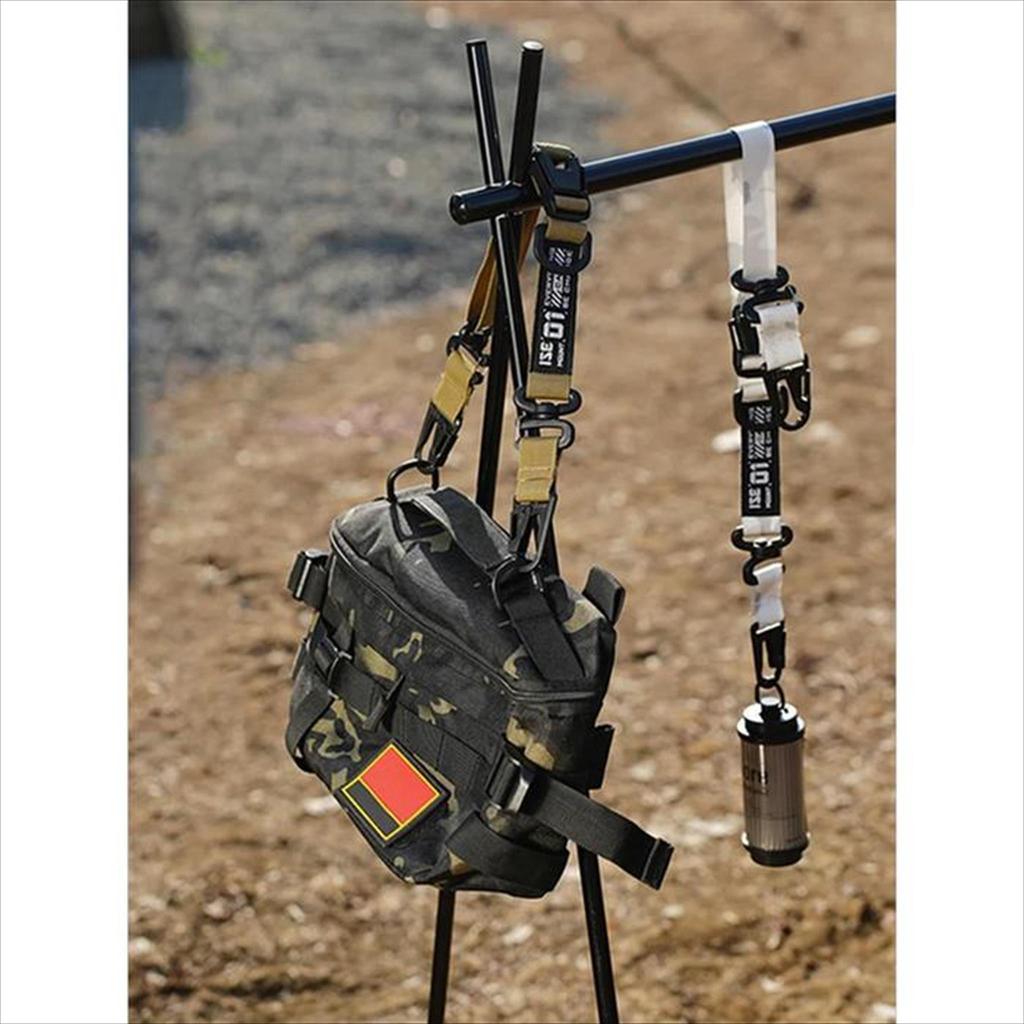 Dilengkapi dengan sistem gantung multi-point menggunakan auxiliary buckle yang memungkinkan kamu menggantung beberapa perlengkapan sekaligus. Strap ini bisa dikombinasikan dengan ransel, rak gantung, atau sistem MOLLE untuk mengatur barang seperti botol minum, senter, alat masak, hingga perlengkapan kecil lainnya.