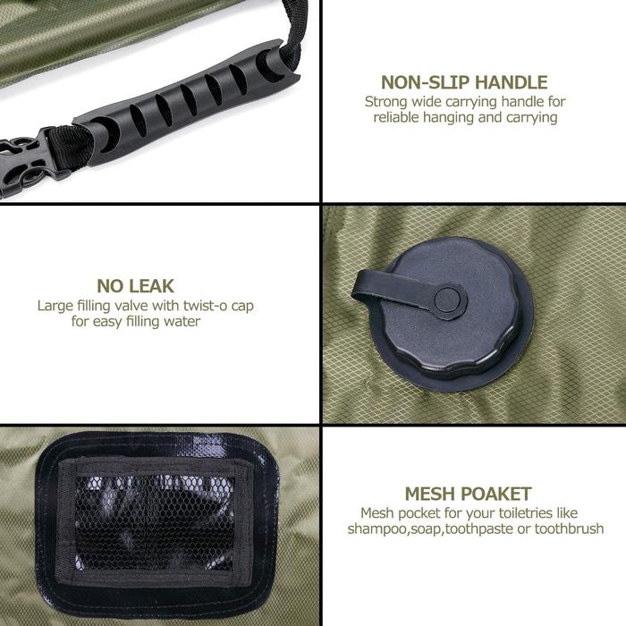 – Kapasitas Air 20L: Tas mandi portabel ini dapat menampung hingga 20L air untuk mandi di luar ruangan. Ideal untuk berkemah di luar ruangan, hiking, backpacking, mengemudi sendiri, memancing atau berburu.