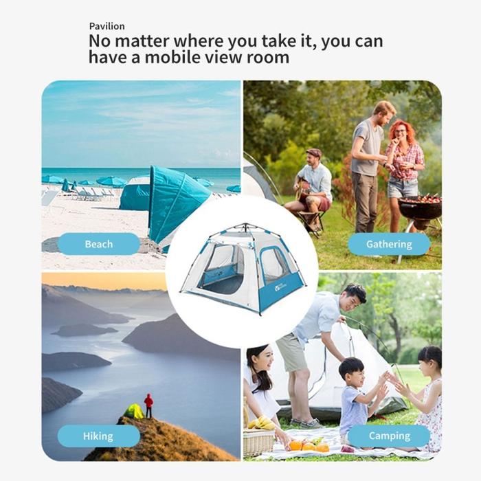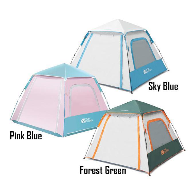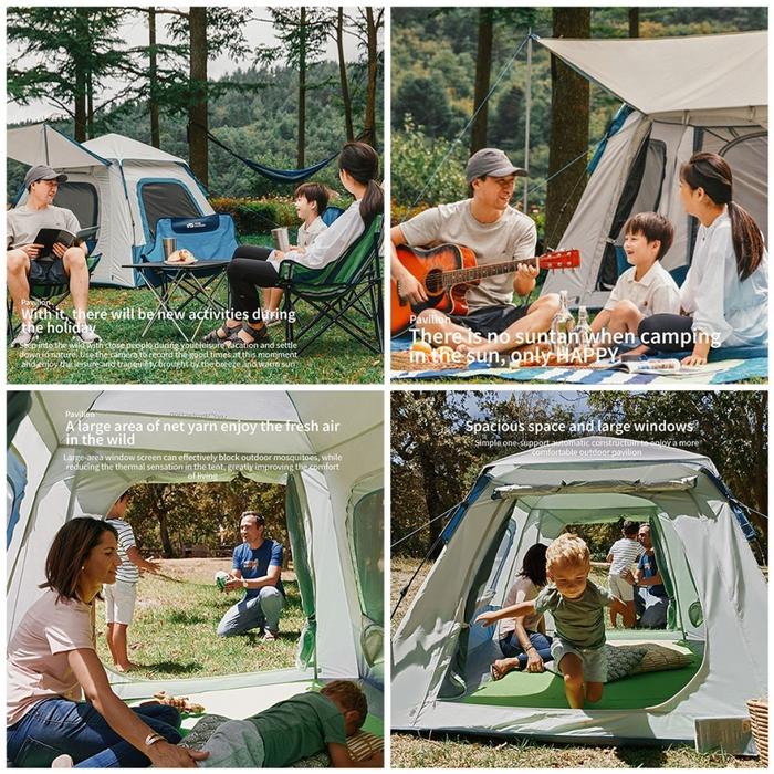 Tenda Otomatis Single layer untuk Camping keluarga beranggota 2 orang dewasa dan 2 anak kecil. Memiliki teras yang dapat di jadikan canopy(sudah termasuk tiang dalam pembelian) untuk memasak, 2 pintu besar dan 2 jendela besar untuk memantau anak anak bermain di luar.