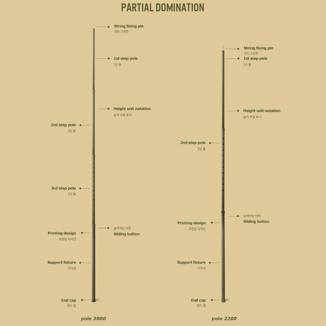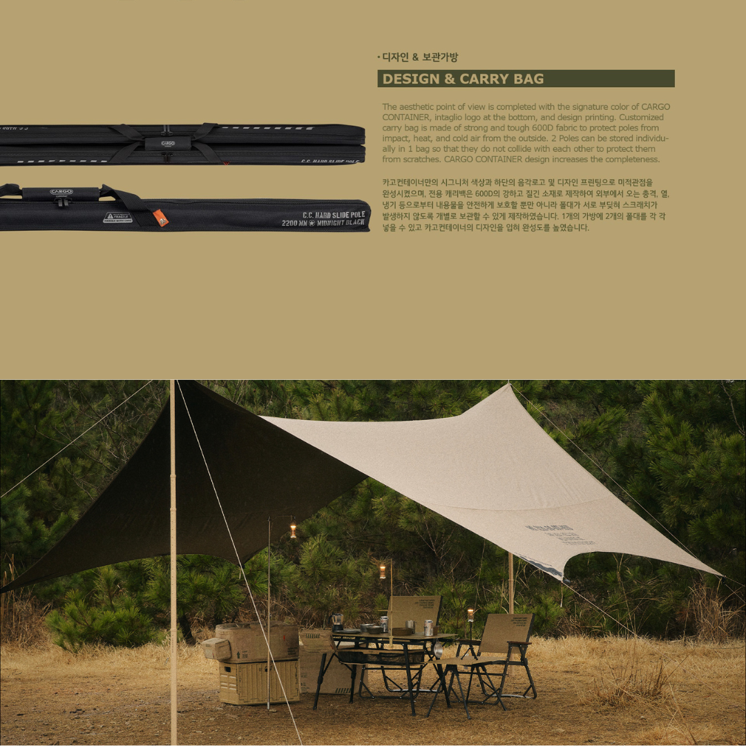 CARGO CONTAINER SLIDE POLE is designed to be installed at the desired length in 3 seconds. The main pole is composed of 1/2/3 steps and the sub pole is composed of 1/2 steps, and one-action extending structure makes it easy to be stopped in desired position when install and disassemble. Plus, the height can be adjusted in 5cm increments and the range of height is MAIN POLE(1100~3000mm)/SUB POLE (900~2200mm). Easy operating structure has a greater effect when install tarp on uneven ground or modify shape of tarp depends on climate. Experience a convenient and sturdy CARGO CONTAINER HARD SLIDE POLE.
