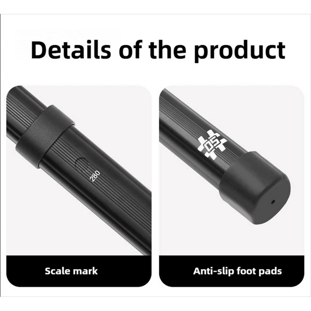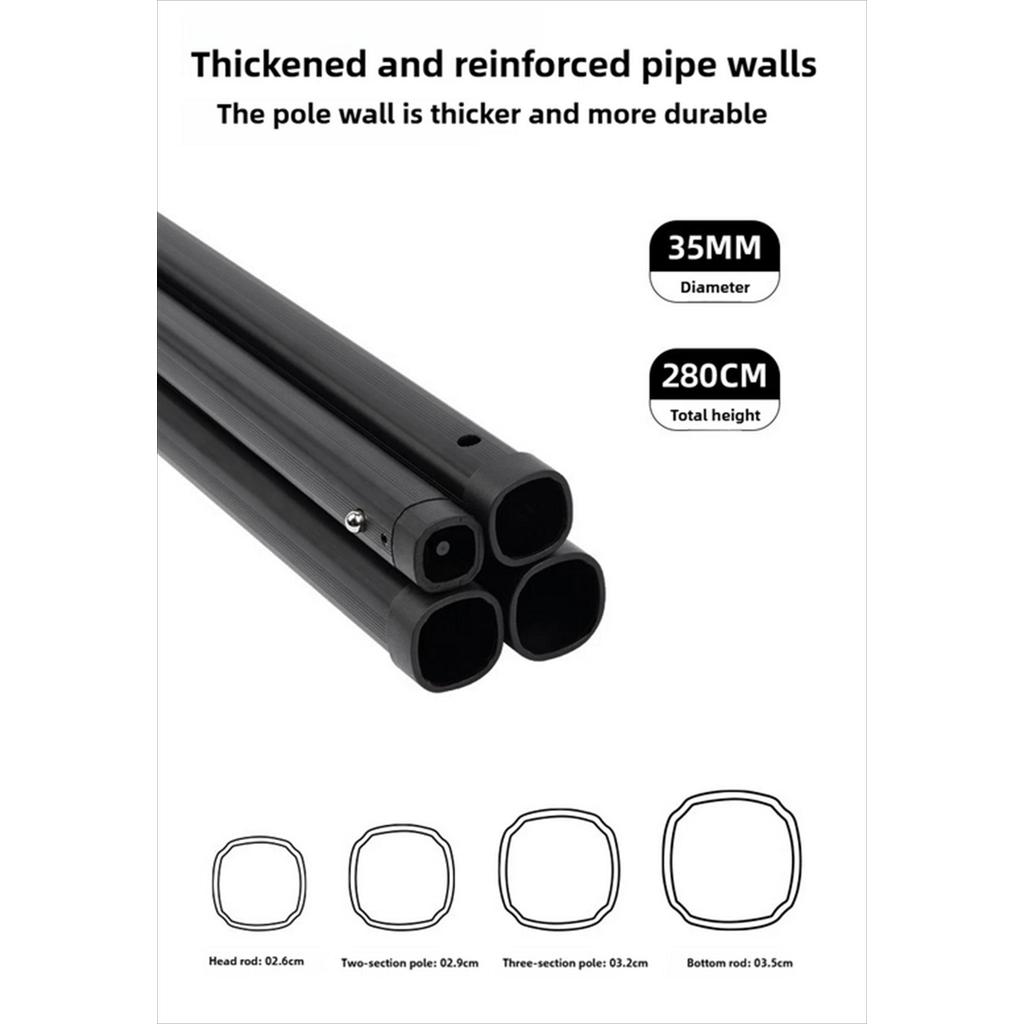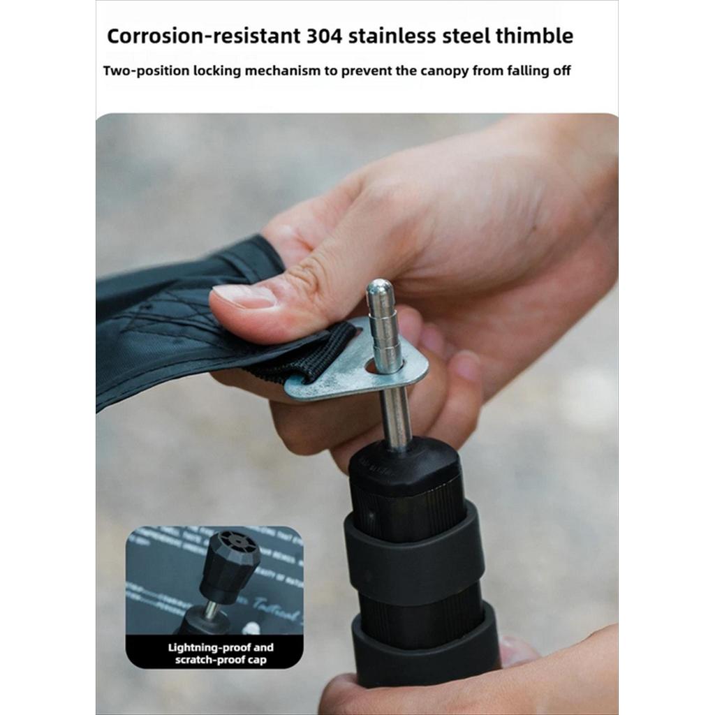 Ujung tiang menggunakan thimble dari stainless steel 304 dengan mekanisme penguncian dua posisi. Ini mencegah kanopi terlepas saat angin kencang. Tiang juga dilengkapi tanda skala (scale mark) untuk pengaturan tinggi secara presisi, dan anti-slip foot pads agar tetap stabil di berbagai permukaan tanah.