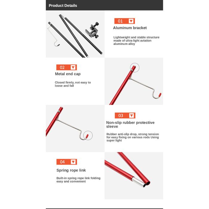 Tiang lampu portabel ini merupakan solusi praktis untuk menggantung lampu saat kegiatan berkemah, hiking, traveling, hingga penggunaan di rumah atau taman. Terbuat dari aluminium alloy 6061 yang ringan namun kokoh, tiang ini mudah digunakan, bisa dilipat, dan serbaguna untuk berbagai keperluan pencahayaan luar ruangan.