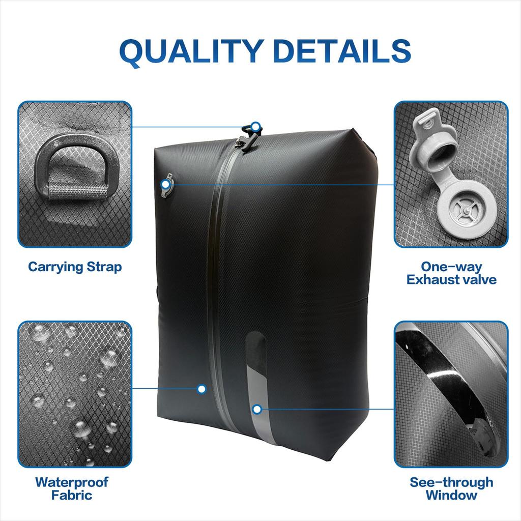 Menggunakan material Nylon + lapisan TPU, tas ini kuat, ringan, serta tidak mudah menyerap air. Desainnya praktis dengan ritsleting kedap air dan katup pembuangan udara satu arah untuk memaksimalkan ruang penyimpanan.